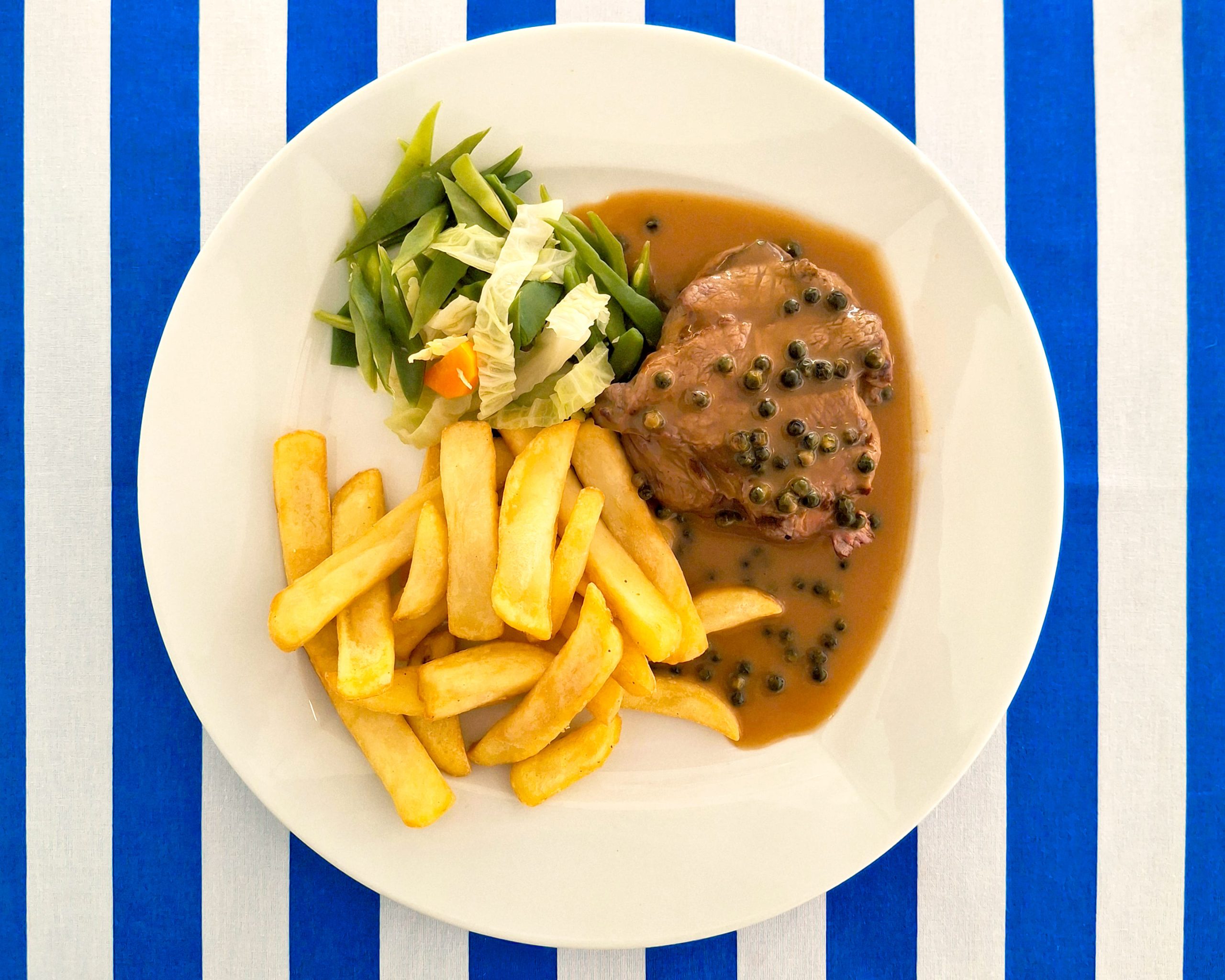Lombo de novilho frito em azeite com um molho de carne, brandi, molho inglês, natas e pimenta verde, acompanhado com batatas fritas e legumes frescos