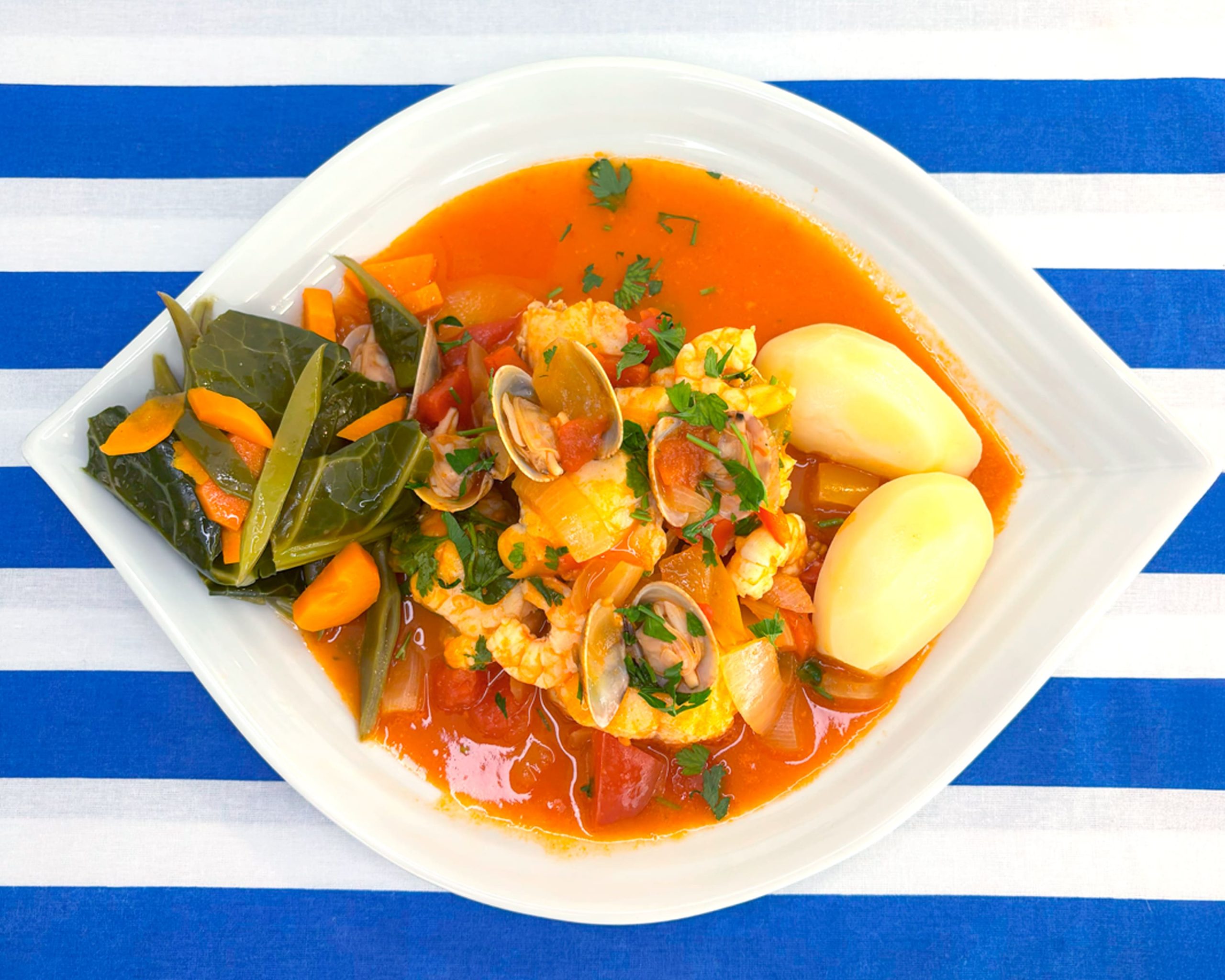 Lombo de tamboril num molho de tomate, cebola, alho e pimentos com amêijoas e camarão, acompanhado com legumes frescos salteados e batata cozida